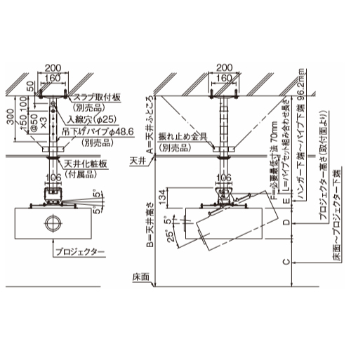 CPJ-USは別売のパイプセットによりスラブに取り付けできます。(天井化粧板はハンガー本体のCPJ-USに付属しています。オプションで傾斜スラブ取付板や振れ止め金具セットもございます。
