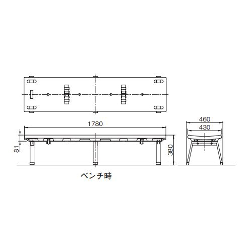 ・ベンチ時のサイズは約W1780×D460×H380mm、担架時のサイズは約W1780×D430×H81mmです。 ・ベンチ時の重量は約22.5Kg、担架時の重量は約7.5Kgです。