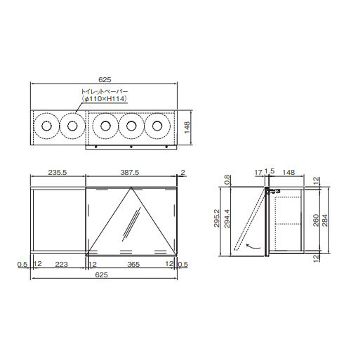 ・手に届き易い位置に取り付け、小物やトイレットペーパーを収納できます。 ・トイレットペーパーは合計10個まで置くことができます。 ・ミラー付きのフラップアップ扉は、跳ね上げ式で90°まで開きます。 ・間口650mm以上ある場所に取り付けられます。