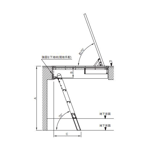 ・組合せ例のNFH-80GAの場合は、ステップの立て掛け角度と天板開閉角度(約70°)がほぼ同じため平行に昇降できます。