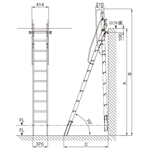 ・ハシゴ受け金具のキズ防止のためハシゴ取付金具にはビニールホースを通しています。また、ハシゴ受け金具に対し横ズレがおきにくいため安全です。