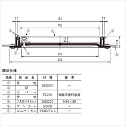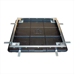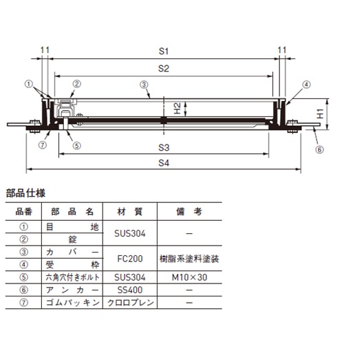 密閉型(防水・防臭)/ボルトロック式/ステンレス目地 充填深さ33mm 適用荷重:T-2 [サイズ]530x530x57mm [本体重量]25.6kg [材質]FC200 [仕上]樹脂系塗装 ●部品仕様 (1)目地 SUS304 (2)錠 SUS304 (3)カバー FC200 樹脂系塗料塗装 (4)受枠 FC200 樹脂系塗料塗装 (5)六角穴付きボルト SUS304 M10×30 (8)アンカー SUS304 (9)ゴムパッキン クロロプレン 【ご注意】カバーの開閉にはMF-44開閉鍵(オプション)を使用します。受枠開口に対して、正方形に躯体を仕上げてください。受枠取付け時には、受枠の固定座(ネジ部)にコンクリートが入らないようにご注意ください。