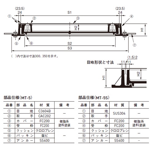 簡易密閉型(簡易防水・防臭)/真鍮目地/ステンレス目 地充填深さ33mm(44mm) 適用荷重:T-2 [サイズ]840x840x75mm [本体重量]87.3kg [材質]FC200 [仕上]樹脂系塗装 ●備考:SUS目地 ●部品仕様(MT-5S) (1)目地 SUS304 (2)取手 SUS304 (3)カバー FC200 樹脂系塗料塗装 (4)受枠 FC200 樹脂系塗料塗装 (5)クッション クロロプレン (6)パ ッ キ ン 塩ビ (8)アンカー SS400 【ご注意】カバーの開閉にはMF-1型フック(オプション)を使用いたします。屋外で使用の場合は、取手の裏側に付いているキャップを外 してご使用ください。取手内に水が溜まり、仕上げ面を汚す原因にもなります。