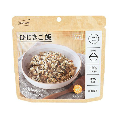 イザメシのごはんシリーズ。 注水量を調節することでごはんまたは雑炊を作ることができ、お湯か水があれば完成する手軽さが魅力です。 アレルギー28品目を持ち込まない工場で製造しておりますので、安心して召し上がっていただけます。 長期保存食として、またはアウトドアシーンでも重宝します。 [名称]アルファ化米(ひじきご飯) [原材料]うるち米(国産)、にんじん、れんこん水煮、食塩、ごぼう、風味調味料、乾燥ひじき、砂糖、しいたけ、ほたて貝ひも、穀物酢、しょうが、植物油脂 [内容量]100g [栄養成分](1袋100g当たり) エネルギー375kcal、たんぱく質7.3g、脂質1.1g、炭水化物83.9g、食塩相当量2.3g [アレルギー物質について] 特定原材料:─ 特定原材料に準ずるもの:─ [賞味期限]製造より5年間※製造から6ヶ月以内の商品をお届けいたします。 [1袋サイズ]W160×H150×GZ42 mm 100g [付属品]スプーン [保存方法]直射日光および高温多湿な場所を避けて常温で保存してください。 ※保存年数は製造日より起算しています。