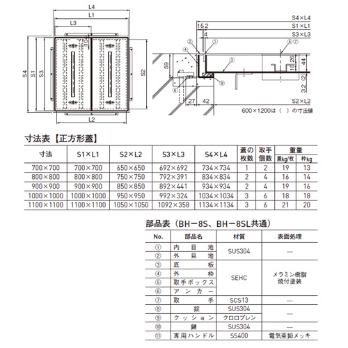 下記以外の寸法及び、耐荷重(歩行用以外)、縞鋼板蓋、ネジ取手タイプ、貼物用、中桟付も製作できますので、詳細についてはお問い合わせください。