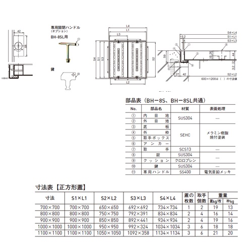 下記以外の寸法及び、耐荷重(歩行用以外)、縞鋼板蓋、ネジ取手タイプ、貼物用、中桟付も製作できますので、詳細についてはお問い合わせください。