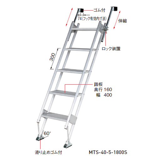 [品番/呼称]MTS-55-5-1800S [サイズ]フックの高さ:1410mm〜1720mm、ステップ最上段高さ:1350mm [重量]11.2kg [材質]アルミ [最大使用質量]100kg