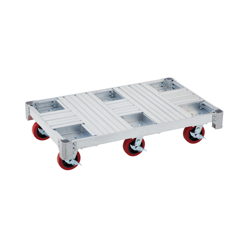・最大使用質量は1000kgです。 ・シンプル構造で補修も可能な軽量アルミ製台車です。 ・四隅にキャスターがはまる構造でスタッキングも容易です。