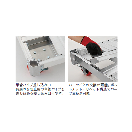 【個人宅配送不可】こちらの商品は個人宅へお届けできません。ご注文が個人宅あての場合はキャンセルとなりますのでご了承ください。 ・運賃諸経費別途お問い合わせください。 ・単管パイプを四隅に差し込める設計です。1m(φ48.6mm)の単管パイプ(別売)をご使用ください。 ・大きな資材を運ぶのにも便利な専用連結金具(別売)もあります。お問い合わせください。