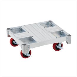 ・最大使用質量は1000kgです。 ・シンプル構造で補修も可能な軽量アルミ製台車です。 ・四隅にキャスターがはまる構造でスタッキングも容易です。
