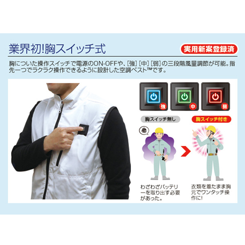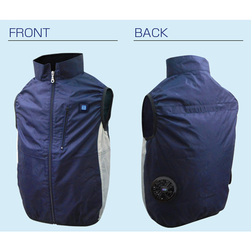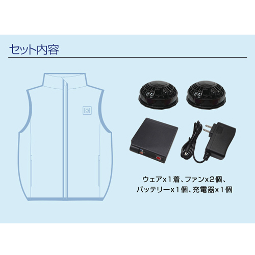 [M-Lサイズ]着丈65cm 胸囲118cm 肩幅44cm [ファン]直径103mm、厚み43mm [充電器コード部]115mm バッテリー:92×72×22mm [重量]ファン:112g、充電器:86g、バッテリー:220g [素材]ポリエステル100%、アクリルコーティング [セット内容]ウェア×1着、ファン×2個、バッテリー×1個、充電器×1個 [カラー]ネイビー
