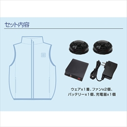 [LL-XLサイズ]着丈67cm 胸囲122cm 肩幅46cm [ファン]直径103mm、厚み43mm [充電器コード部]115mm バッテリー:92×72×22mm [重量]ファン:112g、充電器:86g、バッテリー:220g [素材]ポリエステル100%、アクリルコーティング [セット内容]ウェア×1着、ファン×2個、バッテリー×1個、充電器×1個 [カラー]ネイビー