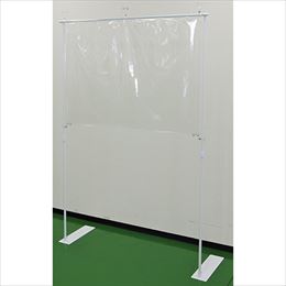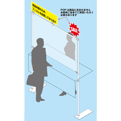 吊り下げや卓上での飛まつ対策が難しい現場向け (スーパー、物販店、サービスショップなどの店舗レジカヌンターなど) [品番] 02-013343 [材質]本体:スチール フィルム:PVC [サイズ]フィルム: W1200mm×H900mm、ポール: H1100mm〜2000mm 伸縮タイプ [横棒]Φ16×1300(650)mm(2本繋ぎ) [左右ポール]Φ16×Φ19×1100mm [立て台]W120mm×D450mm×H50mm [重量]1.4kg ※POPは商品には含まれません。お客様自身でご用意いただく必要があります。