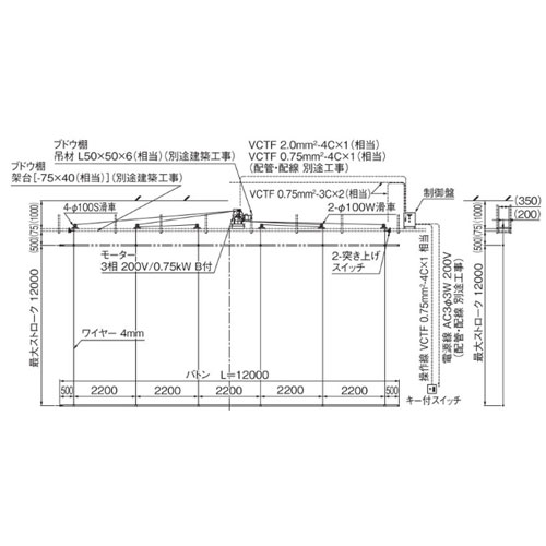 [バトン棒]φ48.6 BL=12000 [吊点数]5点 [吊下荷重]250kgf [最大ストローク]12.0m [制御]DC24V [重量]250.0kg