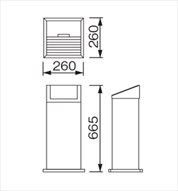 [材質] 本体:スチール、フレーム:ADC、灰皿ボトル:アルミ [仕上げ] 本体:メラミン焼付塗装、フレーム:焼付塗装、灰皿ボトル:アルマイト [サイズ] H665mm、W260mm、W260mm [容量] 3L [重量] 4.9kg