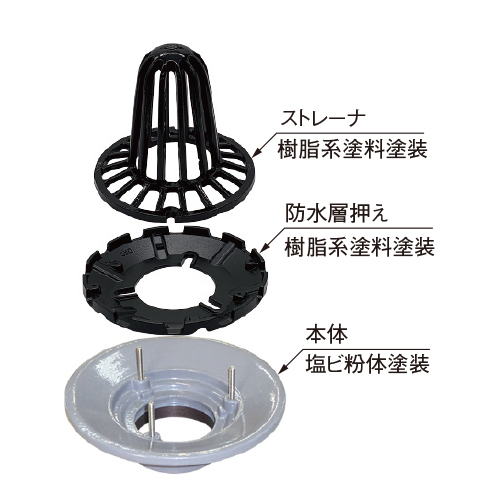 ・防水材メーカーと協同にて鋳鉄製本体に塩ビ被膜を施したルーフドレインを開発しました。
