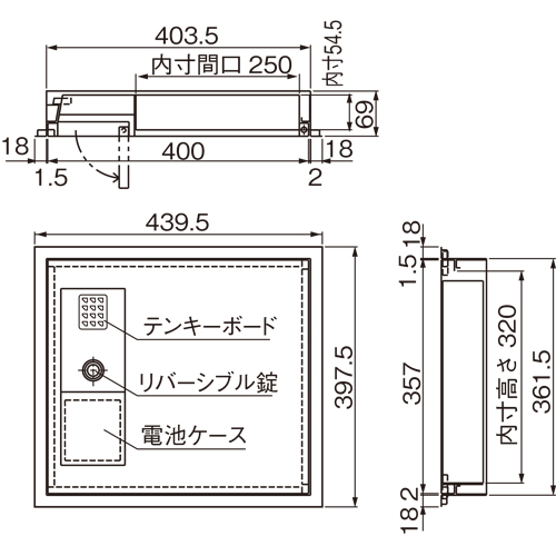 [色]オフホワイト [サイズ]H397.5×W439.5×D69mm(収納部有効寸法:320×250×54.5mm) [重量]16kg [備考]テンキー錠+リバーシブル錠