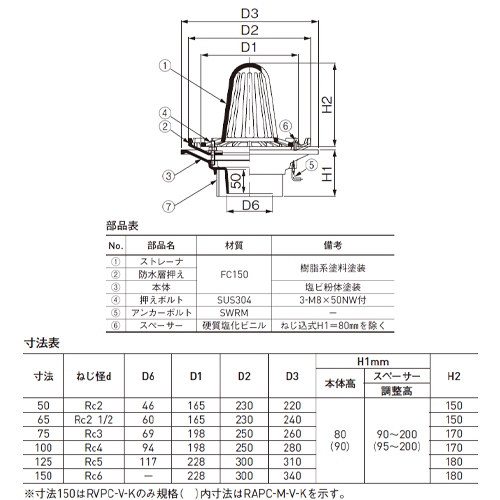 ・防水層施工貼り代は、50mmです。 ・縦型(たて口排水用)・横型(よこ口排水用)共に形状違いのストレ-ナもあります。お問い合わせください。