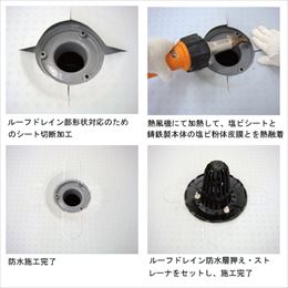 ・屋上において、雨水が集中するルーフドレインは雨仕舞いの要所です。 ・防水材メーカーによると塩ビシート防水施工において塩ビ素材同士を溶着することが、最も信頼性高いとのことです。 ・防水材メーカーと協同にて鋳鉄製本体に塩ビ被膜を施したルーフドレインを開発しました。 ・塩ビ被覆コートは流動浸漬粉体塗装です。