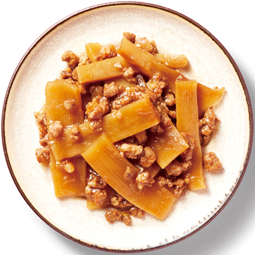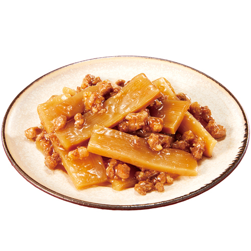 メンマとそぼろ肉を醤油ベースの甘くやさしい味わいに仕上げました。