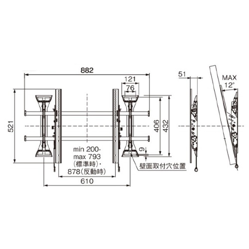 [対応インチ]37〜86インチ [VESA対応規格]最小200×200mm、最大878×500mm [材質]スチール [耐荷重]90.4kgf [重量]8.2kg [備考]傾斜角度調整可能タイプ(MAX12°)