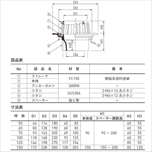 (1)ストレーナ FC150 樹脂系塗料塗装 (2)本体 FC150 樹脂系塗料塗装 (3)アンカーボルト SWRM (4)小ネジ SUS304 2-M6×16 丸小ネジ (5)小ネジ SUS304 3-M6×12 丸小ネジ (6)スペーサー 塩ビ管
