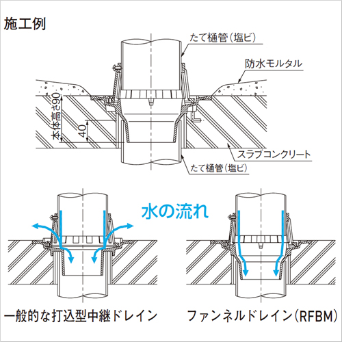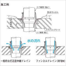 一般的な打込型中継ドレインは、構造上たて樋からの雨水がドレイン本体のフラットな面に当たるため、本体に当たった雨水の一部はストレーナの開口から飛び出します。 独自のファンネル(ろうと)構造により、たて樋からの雨水はスムーズに流れます。 ドレインの本体内で水の流れが改善されるため、通常の中継ストレーナ使用においても雨水の飛び出しは抑えられます。