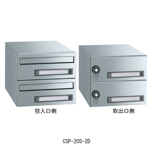 ・前入れ後出しスリムタイプ(屋内仕様・2戸用) ・設置面積をとらないコンパクトサイズですが、A4サイズの郵便物も楽に入ります。 ・鍵不要の静音ダイヤル錠ですから、鍵の紛失の心配がありません。 ・2戸用・3戸用があり、設置スペースに合わせた組み合わせができます。 ・投入口内側にいたずら対策仕様のガードプレート付きです。 ・ハガキやチラシなど薄いものが取り出しやすいテーパー縁です。 [サイズ]H240mm、W280mm、D380mm [本体重量]4.6kg [材質]本体:SUS304 扉:SUS304 [仕上]本体:No.4 扉:No.4 [錠前]静音ダイヤル錠