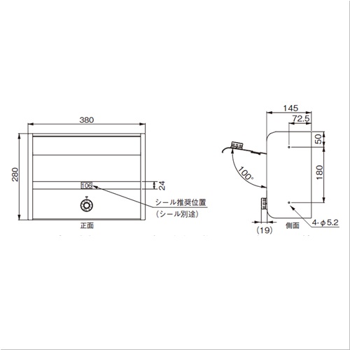 ・前入前出で、静音ダイヤル錠です。 ・薄型・防滴設計なので小規模マンション、アパートや事務所等に最適です。 ・雨水が内部に入った場合でも郵便物が濡れにくいスノコ付きです。 ・扉は開いた状態で止まるストッパー機能がついています。 [サイズ]H280mm、W380mm、D145mm [本体重量]2.3kg [材質]本体:SUS304・PC 扉:アルミ押出形材 [仕上]本体:No.4 扉:アクリル焼付塗装(ブラック) [錠前]静音ダイヤル錠