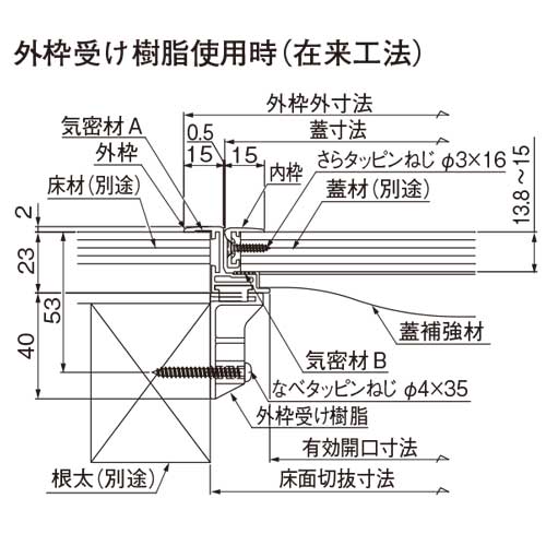 [材質]アルミ [色]シルバー [サイズ]開口寸法:155、外枠外寸法:220、蓋寸法:189、床面切抜寸法:200、蓋仕上材切断寸法:177 [備考]都市機構・気密タイプ [重量]0.64kg