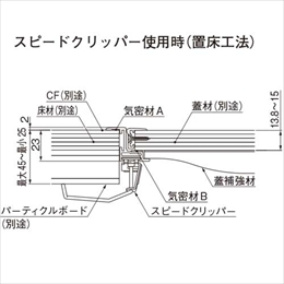 ・12mmのフロア材を使用する場合は、2.5mm程度の合板(ベニヤ板)を捨て張り(接着)してください。 ・スピードクリッパーは、フロア材とパーティクルボードとの厚さ合計が25〜45mmの間で適用します。 ・取手用穴あけ寸法は18×83mm(角穴もしくは長穴)です。