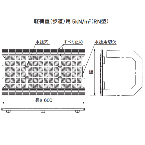 ・表面は滑り止め加工を施した合成ゴムを使用しており、弾力性があり歩行感に優れています。金属製品のようなガタツキや騒音が発生せず静かです。 [色]アンツーカ [品番/呼称]RN-30 [サイズ]溝幅300mm、内幅400mm、長さ600mm、高さ15mm [重量]10.7kg [材質]スチール・合成ゴム [歩行用]5kN/平方メートル
