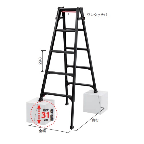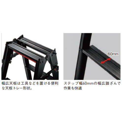 ・凹凸のある場所で活躍する伸縮脚タイプです。 ・ステップ幅60mmで安定感抜群です。 ・最大使用質量は100kgです。 ・はしご、脚立部会認定品。
