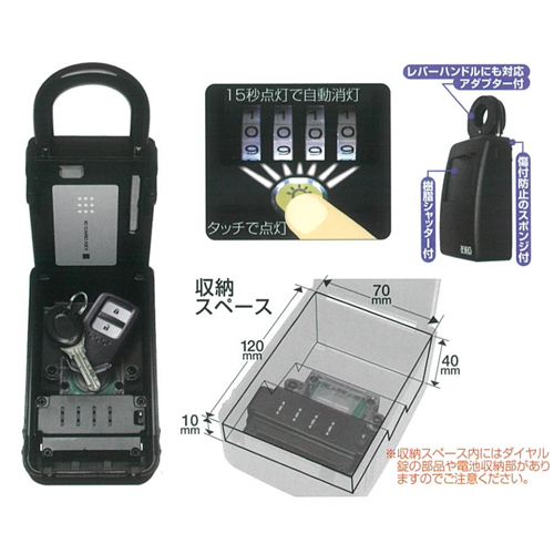 ・ワンタッチでダイヤル部を明るく照らすLEDライト付き。夜間使用に便利。 ・施錠・会場はダイヤル式でキーは不要です。 ・暗証番号は可変式で、お好きな番号に何度でも変更OK! ・収納部は大容量で、カードキーや、自動車大型キー等も収納可能。 ・本体裏面はスポンジ付きで、傷から保護します。 ・ダイヤル部はシャッター付きで、ほこりなどの侵入を防ぎ、シャッターを閉めていればダイヤルが隠れて目立ちにくい! ・アダプター付きでレバーハンドルにも対応しています。