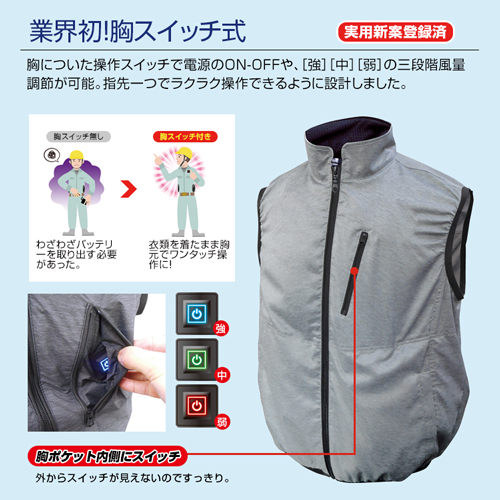 ・胸スイッチは左胸部に取り付け電源のON/OFF、風量調整がバッテリーを取り出さずに行えます。