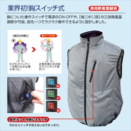 ・胸スイッチは左胸部に取り付け電源のON/OFF、風量調整がバッテリーを取り出さずに行えます。