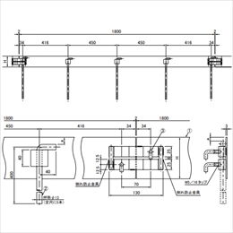 [材質]SS400 [備考]樹脂系塗料塗装(固定金具:電気亜鉛めっき) [サイズ]L=1800、H=150mm [セット質量]9.2kg [対応最小R]1000mm [amm] アンカー部:規格42、最大52 連結部:規格34、最大81