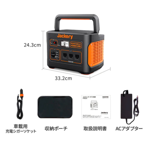 [電池タイプ]リチウムイオン電池 [容量]1002Wh [定格出力]1000W [重量]10.6kg [AC出力]3×100V/10A ,60Hz [シガーソケット]1×12V/10A [USB出力] 1×USB-A出力:5V/2.4A 2×USB-C出力:5V/3A,9V/2A,12V/1.5A 1×QC3.0出力:5〜6V/3A,6.5〜9V/2A,9〜12V/1.5A" [充電温度]0℃〜40℃ [動作温度]-10℃〜40℃ [保管温度]-10〜40℃(炎天下の車内で保管しないでください) [サイズ(横×奥行×高さ)]332×233×243mm [入力ポート]24V-7.5A Max(12-30V対応)