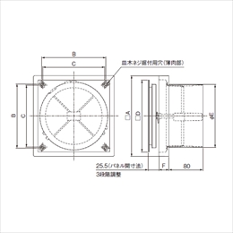 [材質]合成樹脂 [色]ホワイト [サイズ]A:140、B:107、C:102、D:119、E:98、F:22 [適用パイプ]φ100 [相当隙間面積]19.0cm2 [重量]0.2kg
