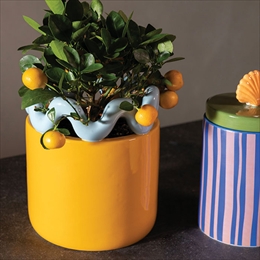 揺れるようなモチーフがついたカラフルな鉢カバー。
