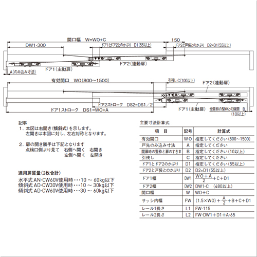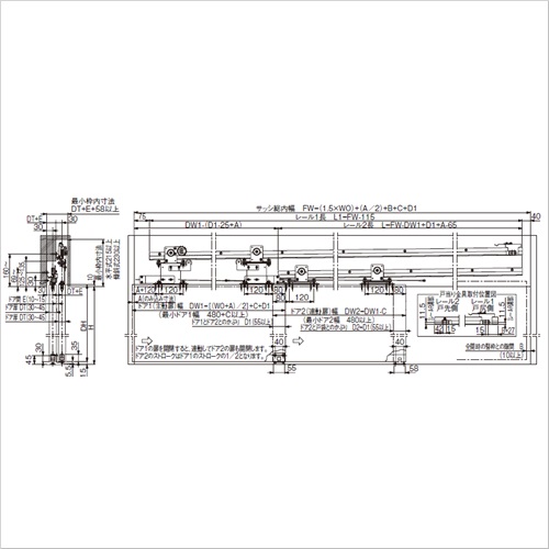 ・図の主要寸法計算式のサッシ内幅は目安です。有効開口サイズ、扉サイズの関係は計算し、正確に出してください。戸先のみ込み寸法、全開時の竪枠と扉との隙間、引残し、ドア2と戸袋とのかぶり寸法により、レールの長さが決まります。長さによっては別途でレールのみを買い足す必要が出てきます。各取り合い寸法は、計算のうえ正確に出してご確認ください。