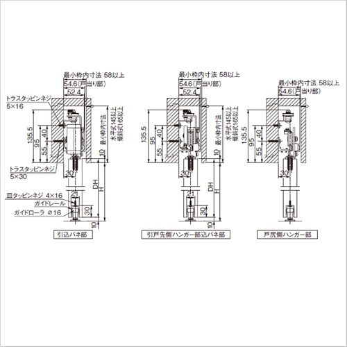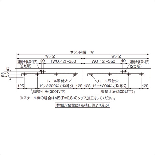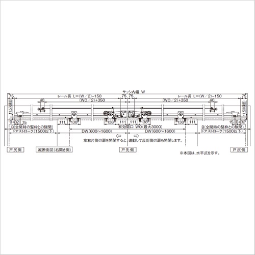 片側の扉を開くと連動して反対側も開き、大きな有効開口が得られます。 木建軽量扉2枚を連動させ、左右に引き分けて開閉する引き戸に変えられる金具セットです。 本セット品はオプションとして、エースクローザーの水平式、傾斜式のどちらかを2セット使用し、本商品を1セット追加することでご使用いただけます。 2枚の扉を重ねて開閉させることにより、有効開口を大きく取り、戸袋のスペースも小さくできます。 [引分け連動装置金具セット部品構成] 1.戸当り 戸当り金具(中央戸当り用):2ヶ なべドリルネジ5×16:4ヶ 2.引分け連動金具 調整金具L:1ヶ 調整金具R:1ヶ アングルL:1ヶ アングルR:1ヶ ワイヤーロープ:2ヶ アルミスリーブ:2ヶ なべ小ネジM5×12(バネ、平座付):8ヶ トラスタッピンネジ5×16 SUS:4ヶ ●適用扉(1枚あたり): 水平式 AN-CW60V使用時…10〜60kg以下 傾斜式 AD-CW30V使用時…10〜30kg以下 傾斜式 AD-CW60V使用時…30〜60kg以下 ドア(適用扉幅):600〜1600mm 有効開口:3000mm以下 【ご注意】引分け連動装置は、壁収納用ストップ戸当り(全開ストップ装置)が取り付けられないため、壁収納タイプにはなりません。引分け連動装置金具セットは、傾斜式・水平式の両方にご使用いただけます。レールは水平式AN-CWか、傾斜式AD-CWのセット品に含まれるものをご使用ください。引分け連動にするには、水平式AN-CWか、傾斜式AD-CWを2セット使用します。それに本商品を1セット追加することで使用します。 図のサッシ内幅は目安です。有効開口サイズ、扉サイズの関係は計算し、正確に出してください。全開時の竪枠と扉との隙間、引残し、戸袋とのかぶり寸法により、レールの長さが決まります。サッシ内幅6000mmまでとしてください。レールの長さの限界です。各取り合い寸法は、計算のうえ正確に出してご確認ください。