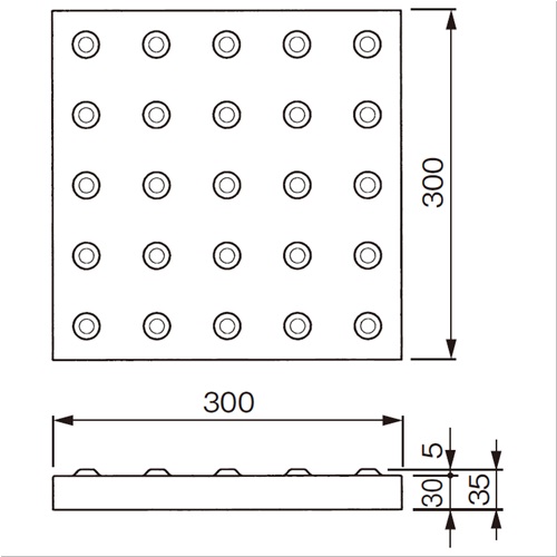 ・突起の形状・寸法及びその配列はJIS T9251に準拠しております。 ・社会福祉法人 日本盲人会連合推薦品です。(内方表示,1線タイルは除く) ・内方表示タイルと1線タイルは、国土交通省「公共交通機関旅客施設の移動円滑化整備ガイドライン」に準拠しております。 [サイズ]300mm×300mm×35mm [重量]6.3kg [材質]コンクリート [備考]駅構内等