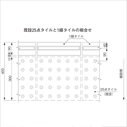 ・タイルは、軽車両等の荷重を受けない場所に敷設してください。 ・車両出入口部分や軽車両等の荷重が作用する可能性のある部分には基礎コンクリートを打設して平板を敷設してください。 ・水ぬれ時や凍結時には歩行条件によって滑りやすくなり危険です。使用場所を十分に検討してください。 ・1線タイルは25点タイルとの組合せに際し、敷設方向が異なります。 組合せの敷設図(上記)を参考にしてください。 ・運搬諸経費は別途お問い合わせください。 ・納期:ご確認ください。