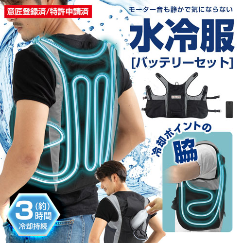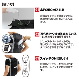 ・すぐに冷たい!内側に張り巡らされたチューブに冷水が循環する仕組みです。 ・静音!静かです。空調ウェアのようにうるさくないのでストレスもありません。 ・簡単チャージ!ペットボトルが解けても、すぐに交換すれば冷水が持続します。 ・水分も補給できる。凍らせたペットボトルが解けたらそのまま飲んで水分補給してもOK。 ・クッション性&通気性。裏面はダブルラッセル(ハニカム構造)でクッション性&通気性。ベタついたり蒸れたりしません。
