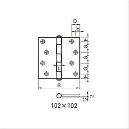 一般木製、アルミ出入口扉にご使用いただけます。 [サイズ]A102mm、B102mm、C2.5mm、D19mm、E10.0mm、F10.2mm、G27.2mm、L12.5mm [本体重量]281g [付属品]SUS十字穴付皿木ネジ 本数:8 太さ:3.8 長さ:25 [材質]SUS304 [仕上]アンバー ●耐荷重(2枚使用時):34kgf 【ご注意】扉の開閉の多い学校、事務所、病院等にご使用いただく場合は摩耗率の低いリング入りの丁番をご用命いただくようお願いします。