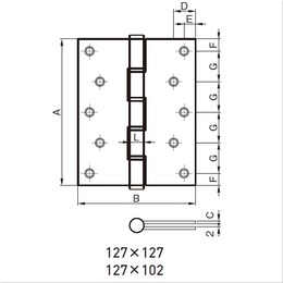 一般木製、アルミ出入口扉にご使用いただけます。 [サイズ]A127mm、B102mm、C2.5mm、D19mm、E10.0mm、F10.5mm、G26.5mm、L12.5mm [本体重量]414g [付属品]SUS十字穴付皿木ネジ:3.8×25:10本 [材質]SUS304 [仕上]アンバー ●耐荷重(2枚使用時):34kgf