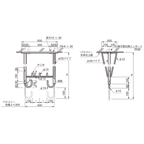 ・商品により左右(→方向)に少し調整をかけ、取付けてください。 ・特注サイズ(高さ寸法H1001mm以上)については、別途対応いたします。お問い合わせください。 ・アルミ補助吊物干金物は、特注対応はしておりません。