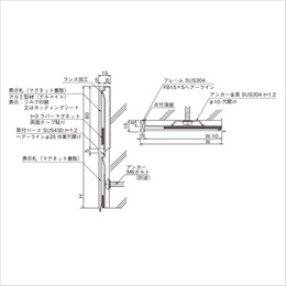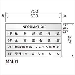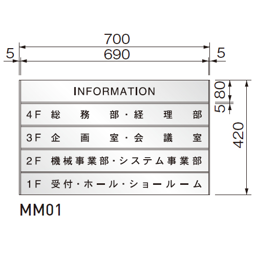 [品番/呼称]MM01 [サイズ]H420mm、W700mm、D15mm [重量]6.71kg [材質]プレート:アルミ フレーム:SUS304 ベース:SUS430 [仕上げ]プレート:アルマイトシルバー フレーム:ヘアーライン ベース:ヘアーライン [ご注意] ・表示パネルは20、40、50、60、80、100、120、150、200の9タイプです。 ・W寸法は最大1500まで製作可能です。(150、200タイプのW寸法は最大1100まで)