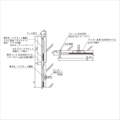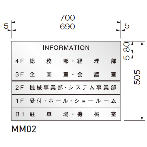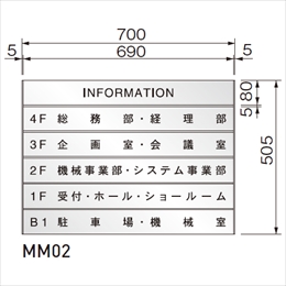 [品番/呼称]MM02 [サイズ]H505mm、W700mm、D15mm [重量]8.25kg [材質]プレート:アルミ フレーム:SUS304 ベース:SUS430 [仕上げ]プレート:アルマイトシルバー フレーム:ヘアーライン ベース:ヘアーライン [ご注意] ・表示パネルは20、40、50、60、80、100、120、150、200の9タイプです。 ・W寸法は最大1500まで製作可能です。(150、200タイプのW寸法は最大1100まで)
